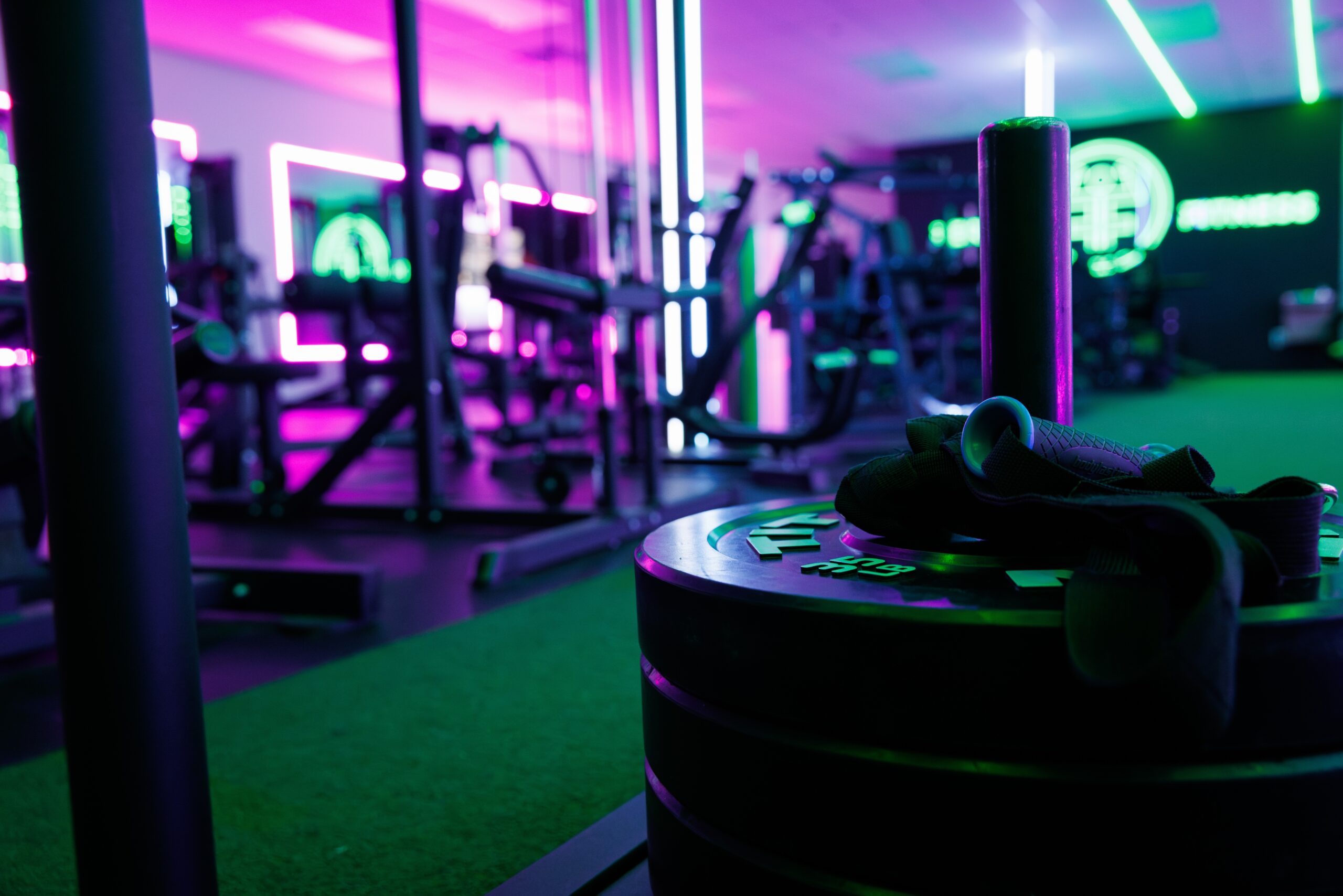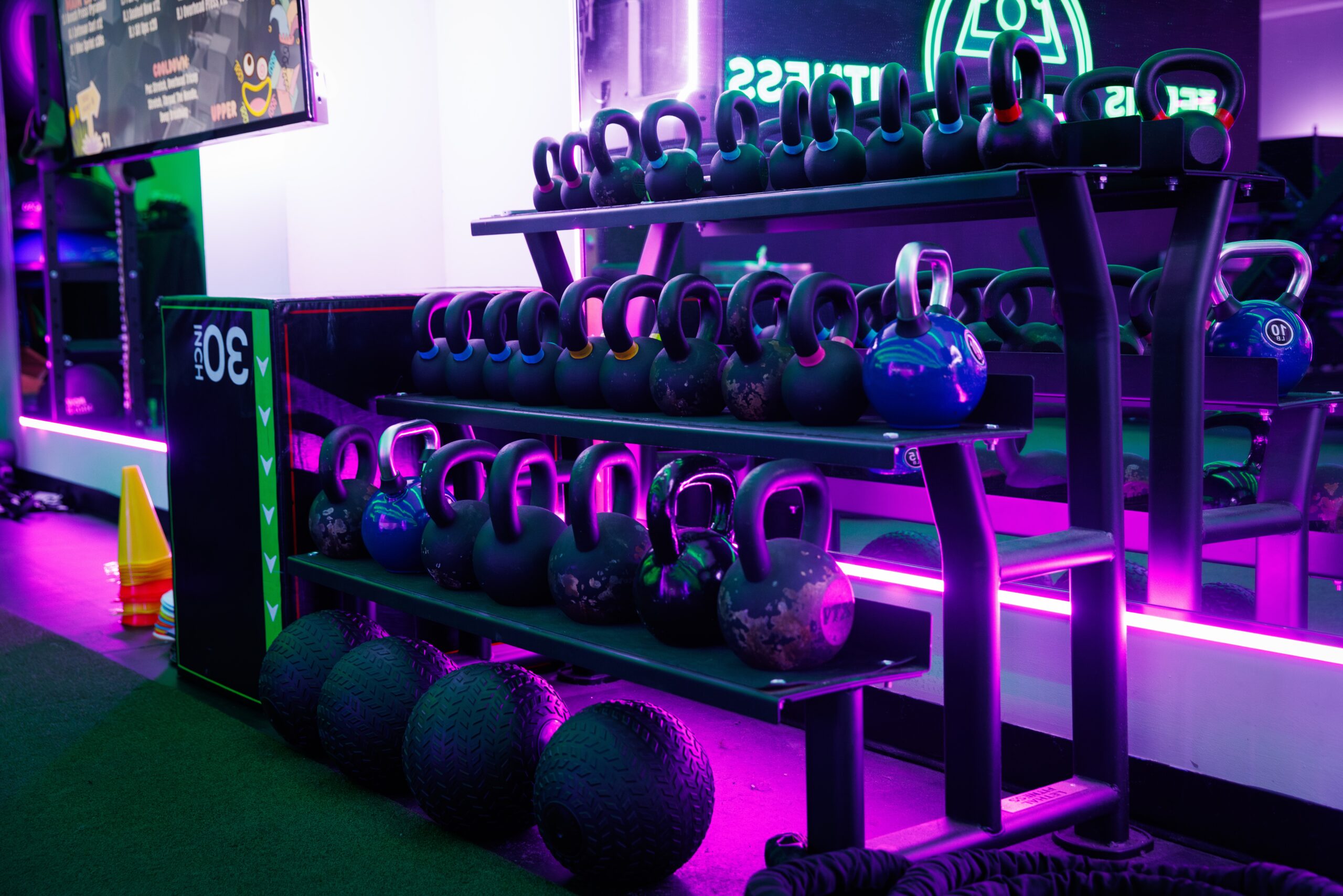 Custom LED lighting around the mirrors, overhead, and behind the TVs — designed to keep the energy right from your first rep to your last.